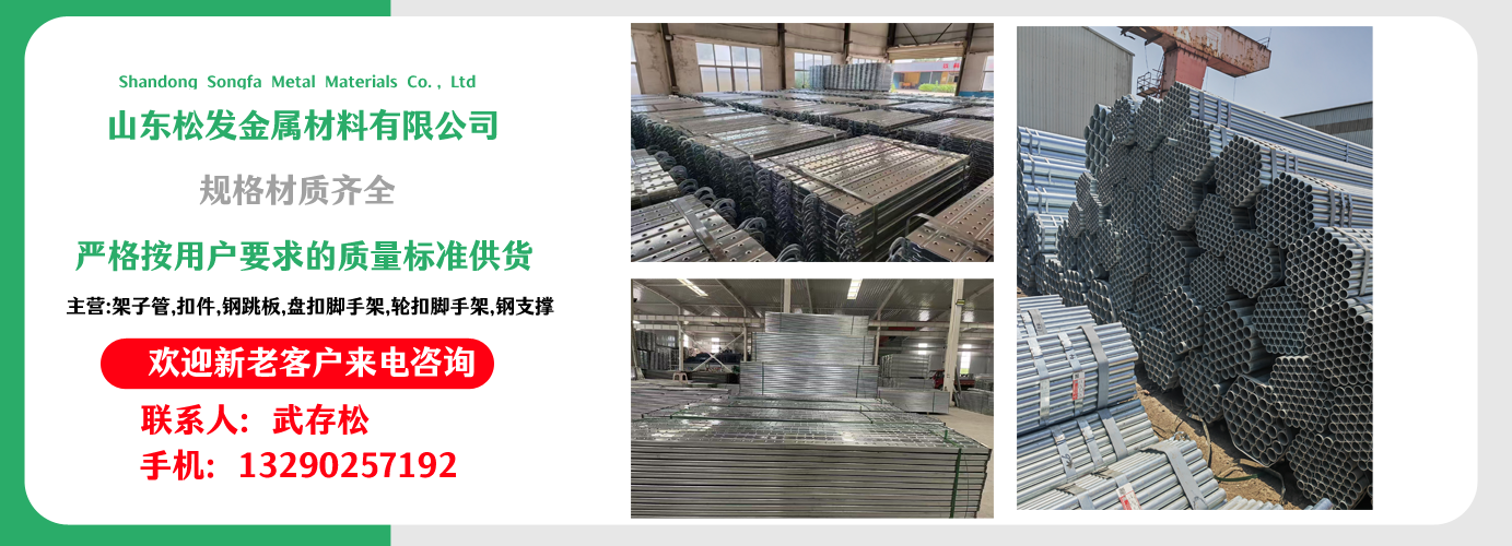 山東松發(fā)金屬材料有限公司主營架子管,扣件,鋼跳板,盤扣腳手架,輪扣腳手架,鋼支撐生產(chǎn)廠家。本廠專業(yè)生產(chǎn)銷售。 建筑用架子管、 主要用于房建,橋梁,鐵路,公路,地鐵,水庫,隧道,支撐。 架子管,扣件,鋼跳板,盤扣腳手架,輪扣腳手架,鋼支撐的優(yōu)越性及應用“ ”產(chǎn)品因具有結(jié)構(gòu)簡單合理、設(shè)計巧妙、使用方便、安全、快捷、易于運輸、儲存、維護簡單等特點。 公司一貫堅持“質(zhì)量,用戶至上,優(yōu)質(zhì)服務,信守合同”的宗旨,憑借著高質(zhì)量的產(chǎn)品,良好的信譽,優(yōu)質(zhì)的服務,產(chǎn)品暢銷全球。歡迎廣大客戶來電洽談,共同發(fā)展,共創(chuàng)輝煌! 山東松發(fā)金屬材料有限公司秉承誠信服務、恪守信譽的宗旨,在同等的質(zhì)量下,保證以最低的價格,最完善的服務,最高的信譽來答謝各界朋友的支持和厚愛,歡迎您的來電、咨詢,我們將竭誠為您服務!...